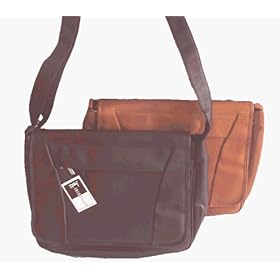 Computer Front Flap Messenger Bag. Made of soft genuine leather by Leather Impressions, this classy messenger bag features two external zippered compartments, and a flap that secures with two velcro strips. Under the flap are three compartments. One padded compartment (13 x 11 inches) holds a laptop computer, which is secured with an elastic strap. The other two compartments are large enough to hold plenty of papers and other items, as well as having smaller pockets for organizing pens and other small items. The messenger bag also features a leather shoulder strap that adjusts up to 70 inches. Dimensions are 16.5 x 12 x 4 inches. Available in Black and Tan. For a larger view of this item, please click on the picture(s).