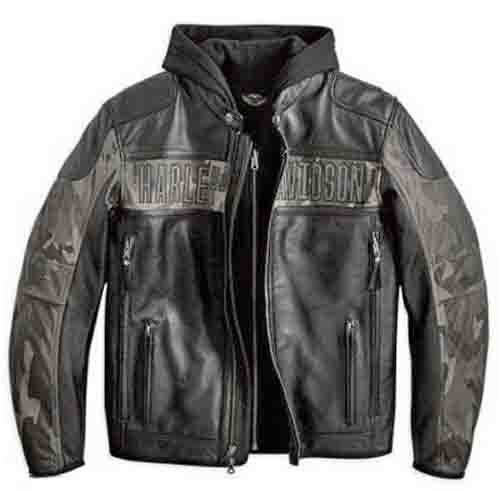 Harley-Davidson® Men's Authority 3-in-1 Leather Jacket-LIMITED EDITION. Midweight leather featuring custom-dyed camouflage leather. 3-in-1 styling. Snap-tab mandarin collar. Front and back vertical vents. Two-way zipper cuff vents. Body armor pockets at shoulders and elbows fit FXRG® lightweight body armor. 100% polyester mesh fixed lining. Removable hooded cotton jersey vest can be worn separately or under the jacket for extra warmth. Two-way zipper front. Action back. Zipper cuffs. Pre-curved sleeves. Two zipper hand-warmer pockets and two inside pockets on leather jacket. Two hand-warmer pockets on removable vest. Custom hardware. Reflective appliqué graphics on front and reflective Bar & Shield logo appliqué on back of leather jacket. 97114-09VM