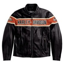Harley Davidson Men's Thunder Hill Jacket. Midweight leather. Two vertical front and back vents. Action back. Zippered front. Zippered cuffs. Power stretch side panels. Two zippered hand-warmer pockets and one zippered inside pocket. Distinctive Orange Stripe Design and embroidered Harley-Davidson® race-inspired graphics on sleeves, front, and back. 98296-08VM