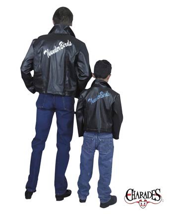 Includes a faux black leather jacket with front zipper and "Thunderbirds" in white script letters on the back. Jeans and boots not included. 100% Polyurethane with cloth backing.