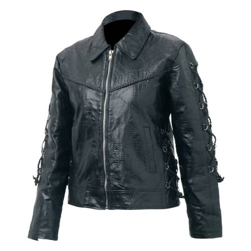 This radical design features alligator embossing, embroidered rose on the back, decorative braiding, laced arms and sides, slash pockets and is fully lined.