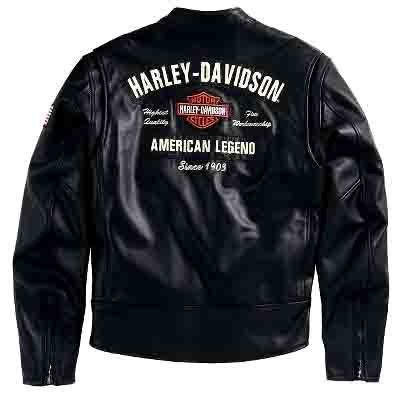 Harley-Davidson® Men's American Legend Leather Jacket. Made in USA! Midweight, Action Back, Mandarin Collar, Zippered Cuffs, Hand Warmer Pockets, Embroidery at Left Chest and Large Classic Embroidery on Back, Flag Patch on Inside Pocket and Left Sleeve. 98135-05VM