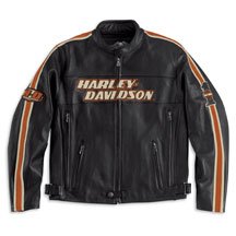 Harley-Davidson® Men's Torque Leather Jacket, Black with Orange Racing Stripes, Midweight Leather, Zip Front and Hand Warmer, Vents Front and Back, Body Armor, Leather Appliqué, Harley-Davidson® Block Print Across Chest, Race-Inspired Patches on Sleeves, 98114-06VM