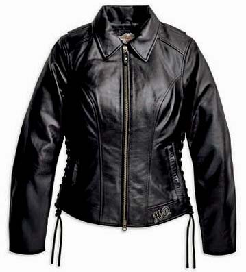 Harley Davidson Women's Horizon Leather Jacket. Midweight leather jacket with snap-down collar, fixed poly-satin lining and decorative laces on sides and sleeves. Action back. Slightly pre-curved sleeves with zippered cuffs. Two hand-warmer pockets and two inside pockets. Embroidered Harley-Davidson® graphics on left pocket. Screen-printed and embroidered Harley-Davidson® graphics on back. 98133-08VW