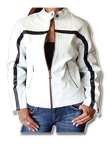 This ladies motorcycle jacket can be worn on of off the bike. It is a white cowhide jacket with a black racing strip through the middle. It features a Mandarin style collar, zip front, and two front zippered pockets.