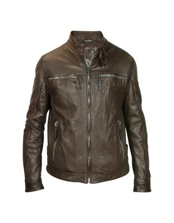 Forzieri's contemporary motorcycle jacket in soft dark brown leather features tough zippered exterior pockets, a band collar with snap tab closure, and luxurious quilted lining. Made in Italy