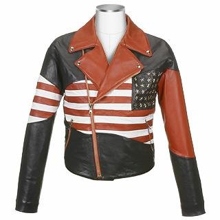 A patriotic American take on the motorcycle jacket in red, white and blue leather adorned with metal stars and wrap-around stripes. An asymmetrical zipper and wide studded collar round out the bold and unique look. Made in Italy