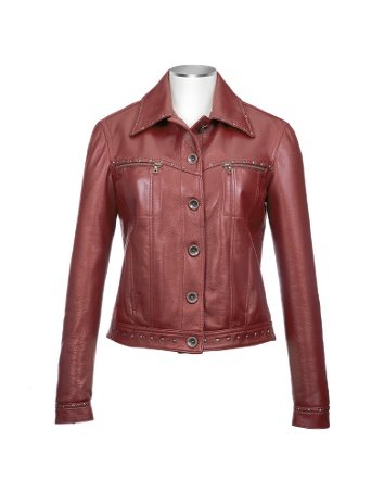 With a rock-punk edge, a determined jacket in red Italian leather is embellished by brass studs on front, collar and sleeves. Made in Italy