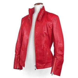 A fiery red leather motorcycle jacket by Forzieri is sure to spice up your wardrobe with zippered detailing along the sleeves and a tough buckle tab along the band collar. Made in Italy