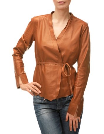 This exquisite lightweight jacket is crafted from buttery soft tan leather with a roughly scalloped bottom edge and an elegant tie belt. Made in Italy.