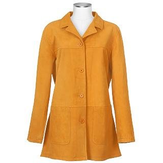This lightweight unlined coat by Forzieri is made of rich and supple suede in a vibrant apricot orange tone with a straight, a-line silhouette that looks flattering on any figure.